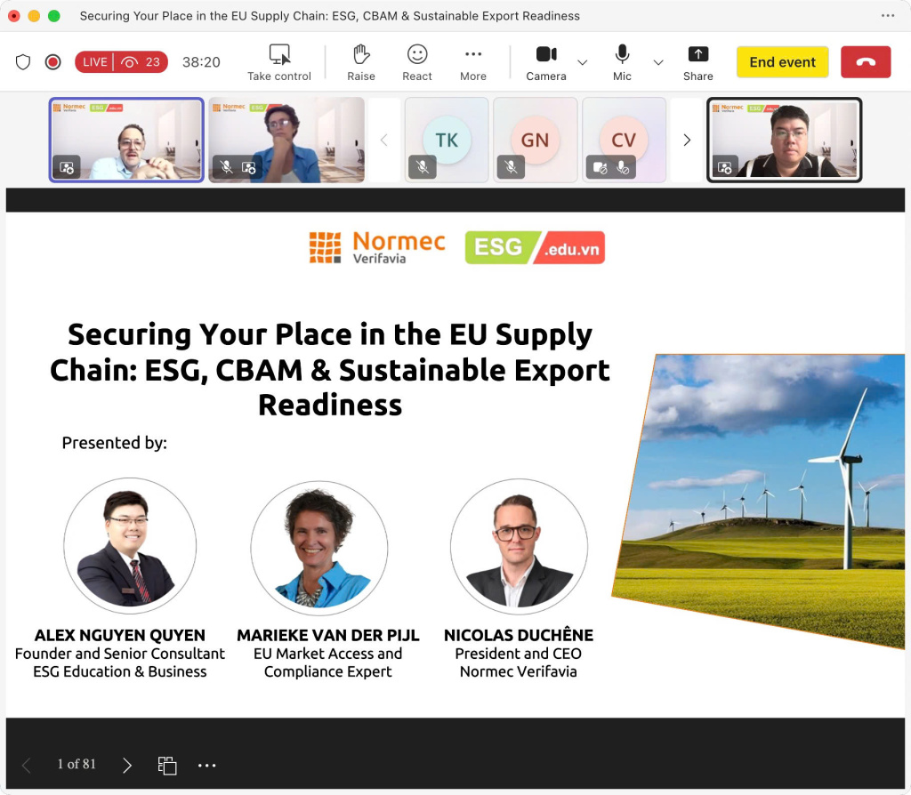 Sự kiện có sự tham gia trình bày của ba chuyên gia quốc tế là Ông Nguyễn Đình Quyền – Founder của ESG Education & Business, bà Marieke van der Pijl -Chuyên gia độc lập về khung pháp lý EU và Ông Nicolas Duchene – CEO của Normec Verifavia, tập trung vào những nội dung then chốt: