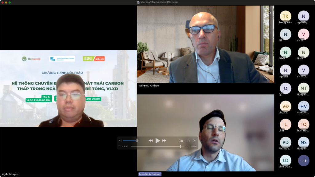 Hội nghị trực tuyến do Hiệp hội Xi măng và Bê tông Toàn cầu (GCCA) phối hợp cùng các chuyên gia tư vấn của ESG Education & Business tại Việt Nam tổ chức đã diễn ra thành công, thu hút sự tham dự của các lãnh đạo ngành, chuyên gia và doanh nghiệp trong lĩnh vực vật liệu xây dựng.